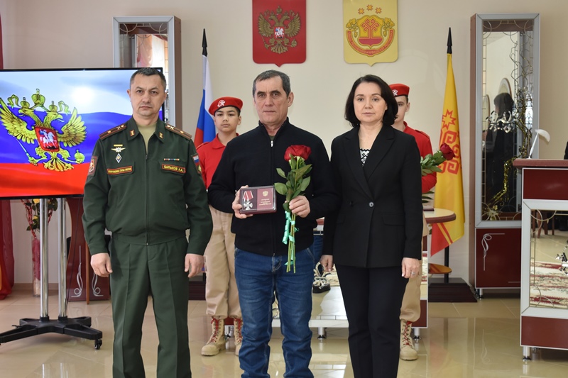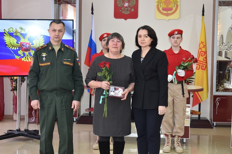 Сегодня в отделе ЗАГС состоялась торжественная церемония передачи высоких наград на хранение матерям и отцам, семьям бойцов. Ордена и медали им вручили Врио военного комиссара Ибресинского и Вурнарского районов Андрей Балыков и глава округа Надежда Никандрова.